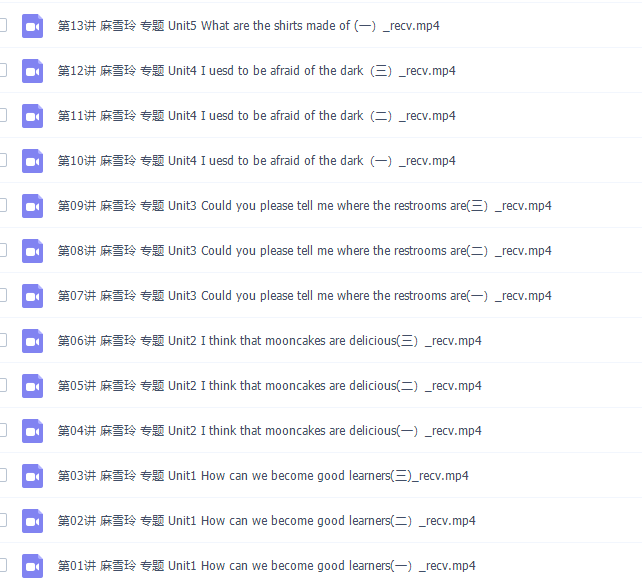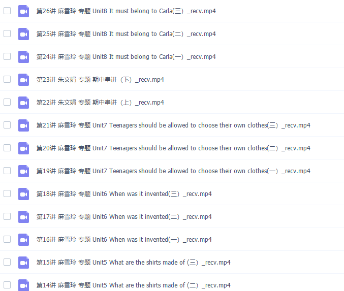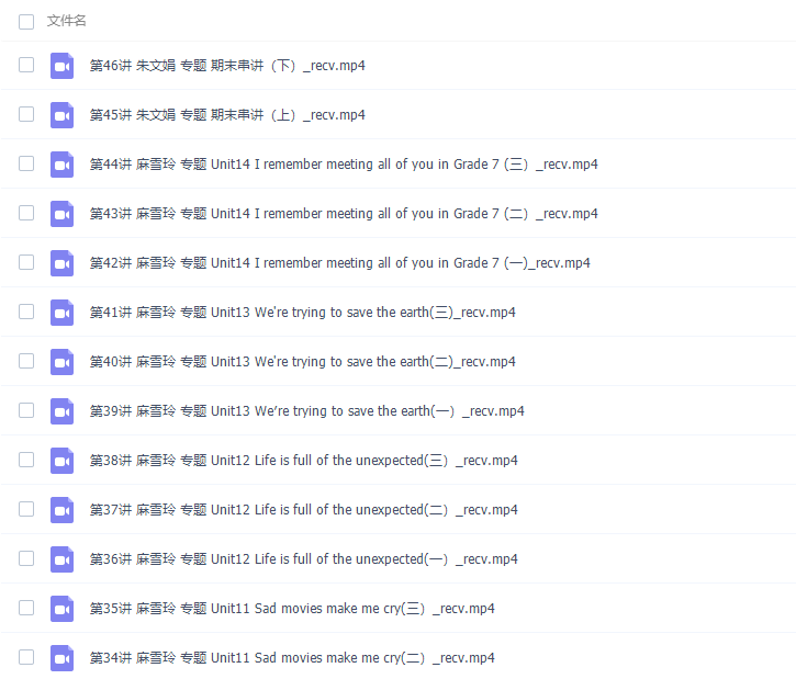 此课件来自简单学习网,初三英语麻雪玲同步基础课程课程。此课件主要知识点包括:Unit1 How can we become good learners、Unit2 I think that mooncakes are delicious、Unit3 Could you please tell me where the restrooms are、Unit4 I uesd to be afraid of the dark、Unit5 What are the shirts made of、Unit6 When was it invented、Unit7 Teenagers should be allowed to choose their own clothes、期中串讲、Unit8 It must belong to Carla、Unit9 I like music that I can dance to、Unit10 You are supposed to shake hands、 Unit11 Sad movies make me cry、Unit12 Life is full of the unexpected、Unit13 We′re trying to save the earth、Unit14 I remember meeting all of you in Grade 7、期末串讲。
