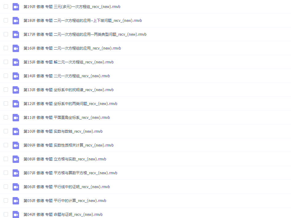 此课件来自傲德初一数学满分冲刺下学期高清视频课程,此课件主要知识点包括:相交的线、平行线及判定、平行线的性质和平移、命题与证明、命题与证明、平行中的计算、平行线中的证明、平方根与算数平方根、立方根与实数、实数性质相关计算、实数与数轴、平面直角坐标系。。。。