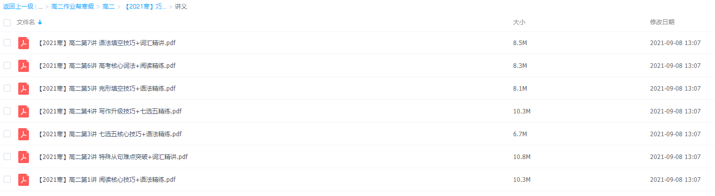 高二一年的学习重点是单词积累、阅读能力的培养、听力技巧的探索以及适当积累写作素材。单词量的大小,在一定程度上决定英语水平的高低,因此,在高二一年里要花大力气去记单词,至少要把大纲要求掌握的单词熟记两遍(单词和短语不超过5000),建议买一本高考词汇书。此外,每天坚持读1—2篇阅读(包括完型和短改),切记,这是获得高分的保证。此课件来自作业帮网校,2021作业帮寒假巧英语-高二尖端班(张亮),包括课程视频回放以及资料讲义。