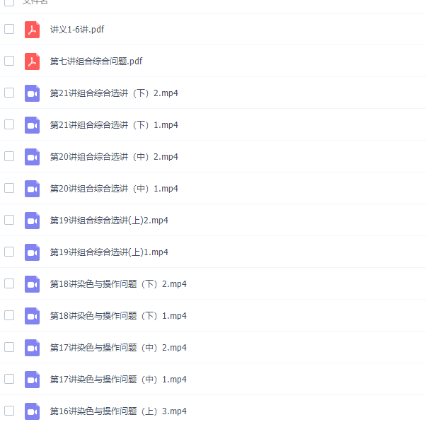 此课件来自学而思网校,陈晨3阶高一全国数学联赛班视频课程完。此课件主要知识点包括:组合计数、组合恒等式、抽屉原理与极端原理、容斥原理与极端原理、染色与操作问题、组合综合选讲。