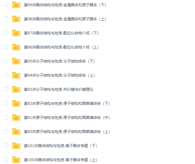 此课件来自学而思网校,高二化学选修3专题课程满分高清视频课程。此课件主要知识点包括:原子结构与性质-原子结构和周期律综合、分子结构与性质-共价键与价键理论、分子结构与性质-分子结构综合、晶体结构与性质-配位化合物介绍、晶体结构与性质-金属晶体和原子晶体、晶体结构与性质-离子晶体专题。