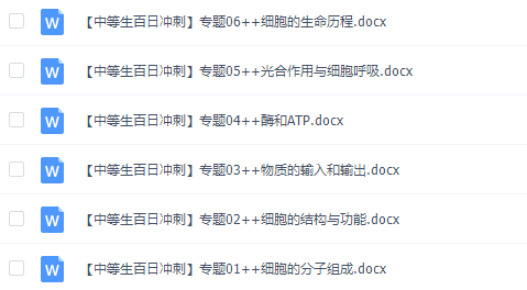 此课件来自《百日冲系列》生物中等生高考备考百日捷进Word版,此课件包括:细胞的生命历程、光合作用与细胞呼吸、酶和ATP、物质的输入与输出、细胞的结构与功能、细胞的分子组成。