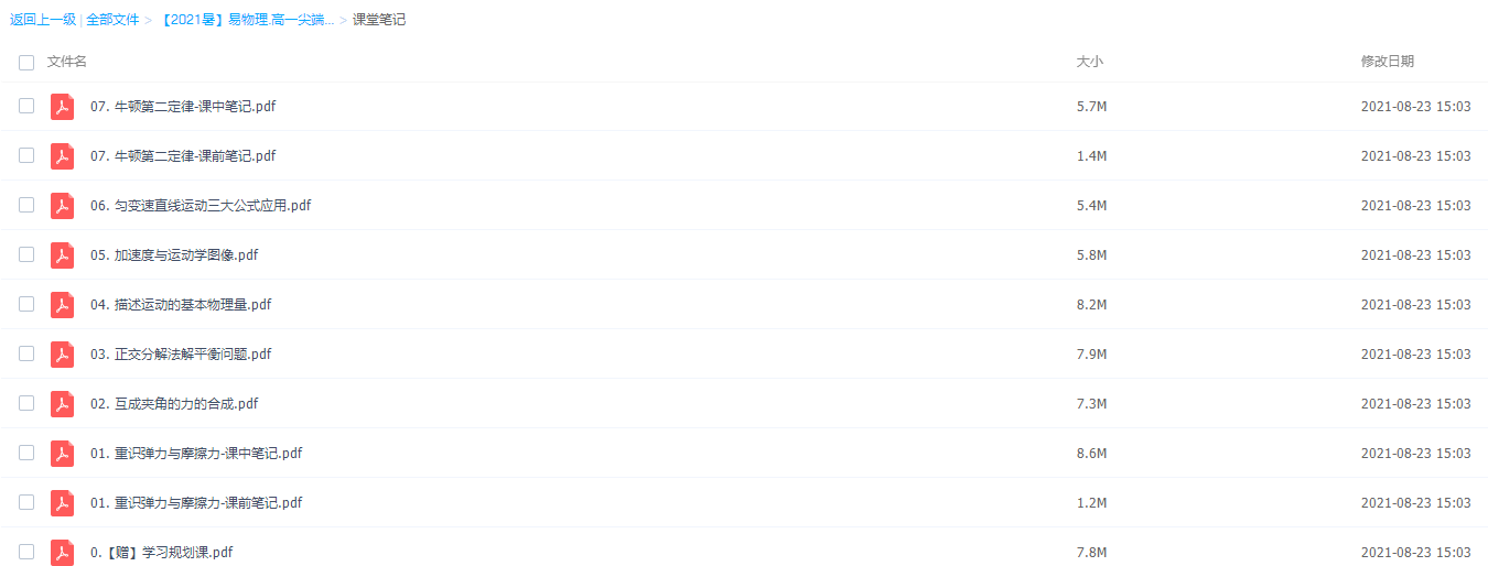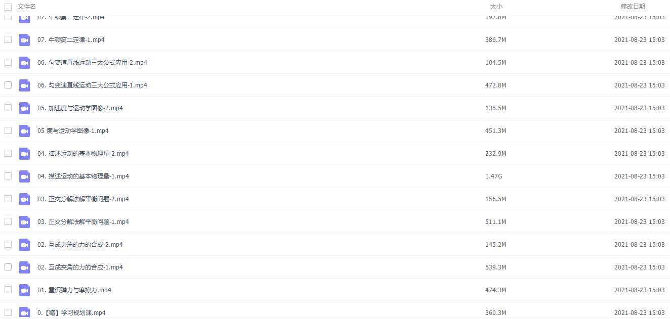 此课件来自作业帮网校,2021暑假作业帮胡婷高一物理尖端班视频课程,包含视频课程和讲义资料 。主讲胡婷老师善于挖掘学生思维盲区,思路一下子就清晰了,恍然大悟。此课件主要知识点包括:重识弹力与摩擦力、互成夹角的力的合成、正交分解法解平衡问题、描述运动的基本物理量、加速度与运动学图像、匀变速直线运动三大公式应用、牛顿第二定律等视频。