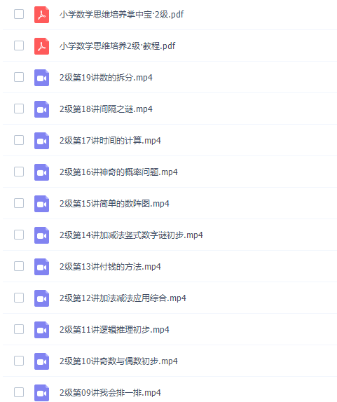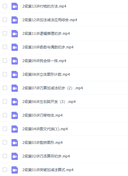 此课件来自学而思网校,一年级数学思维培养教程2级视频课程。此课件主要知识点包括:突破加减法算式、巧添算符初步、剪拼图形、图文代换、巧移物体、左右脑开发、巧算加减法初步、立体图形计数、奇数与偶数初步、逻辑推理初步、加法减法应用综合、付钱的方法、加减法竖式数字谜初步、简单的数阵图等等视频课程。