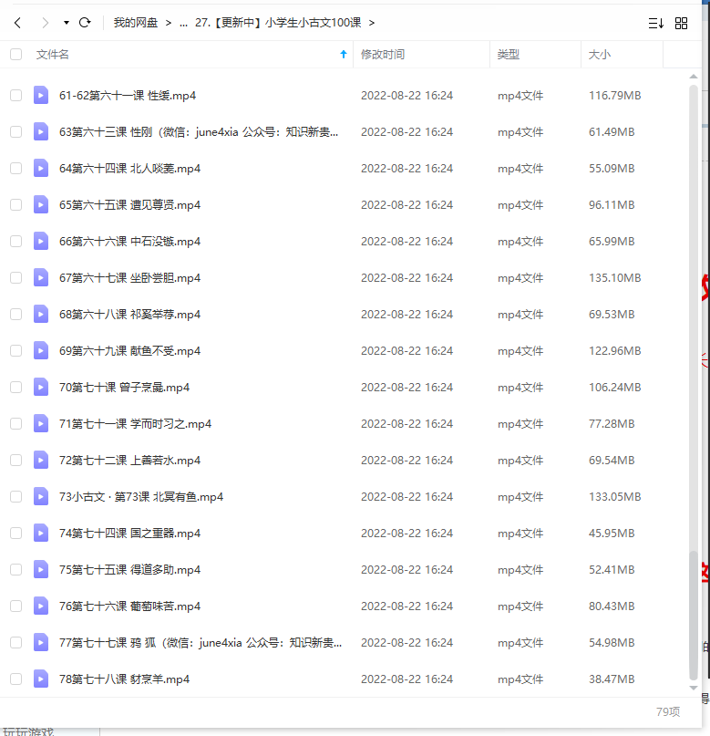 小学生小古文100课,目前只更新到78课,MP4视频文件,,每集大概10-20分钟 声明:本站资源来自会员发布以及互联网公开收集,不代表本站立场,仅限学习交流使用,请遵循相关法律法规,请在下载后24小时内删除。 如有侵权争议、不妥之处请联系本站删除处理! 请用户仔细辨认内容的真实性,避免上当受骗!