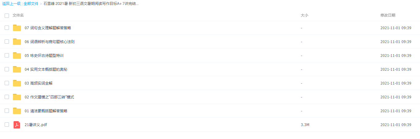 此课件来自学而思网校,2021学而思石雪峰新初三语文暑期阅读写作目标A,包含视频课程和讲义资料 。主讲老师熟知语文学科知识体系,注重启发式教学,其课堂生动有趣、讲解透彻、实用性强、提高语文做题技巧明显。此课件主要知识点包括:清洁累概括题解答策略、作文建模之“四部三转”模式、高频实词全解、实用文本概括题的奥秘、咏史怀古诗题型特训、词语辨析与病句题核心法则 等视频